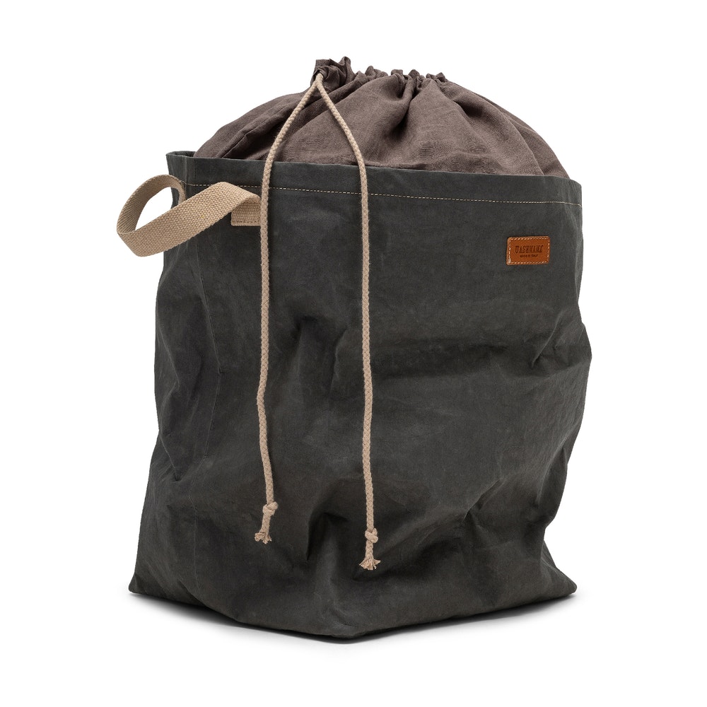 En yderst populær vasketøjskurv samt opbevaringskurv fra UASHMAMA. Vasketøjskurven har 2 praktiske bomuldshåndtag, som gør det nemt at flytte den fra rum til rum. Posen har ydermere et smart snoresystem, så du kan lukke af for posens indhold. Tasken er vandafvisende og kan foldes fladt sammen, når den ikke er i brug.