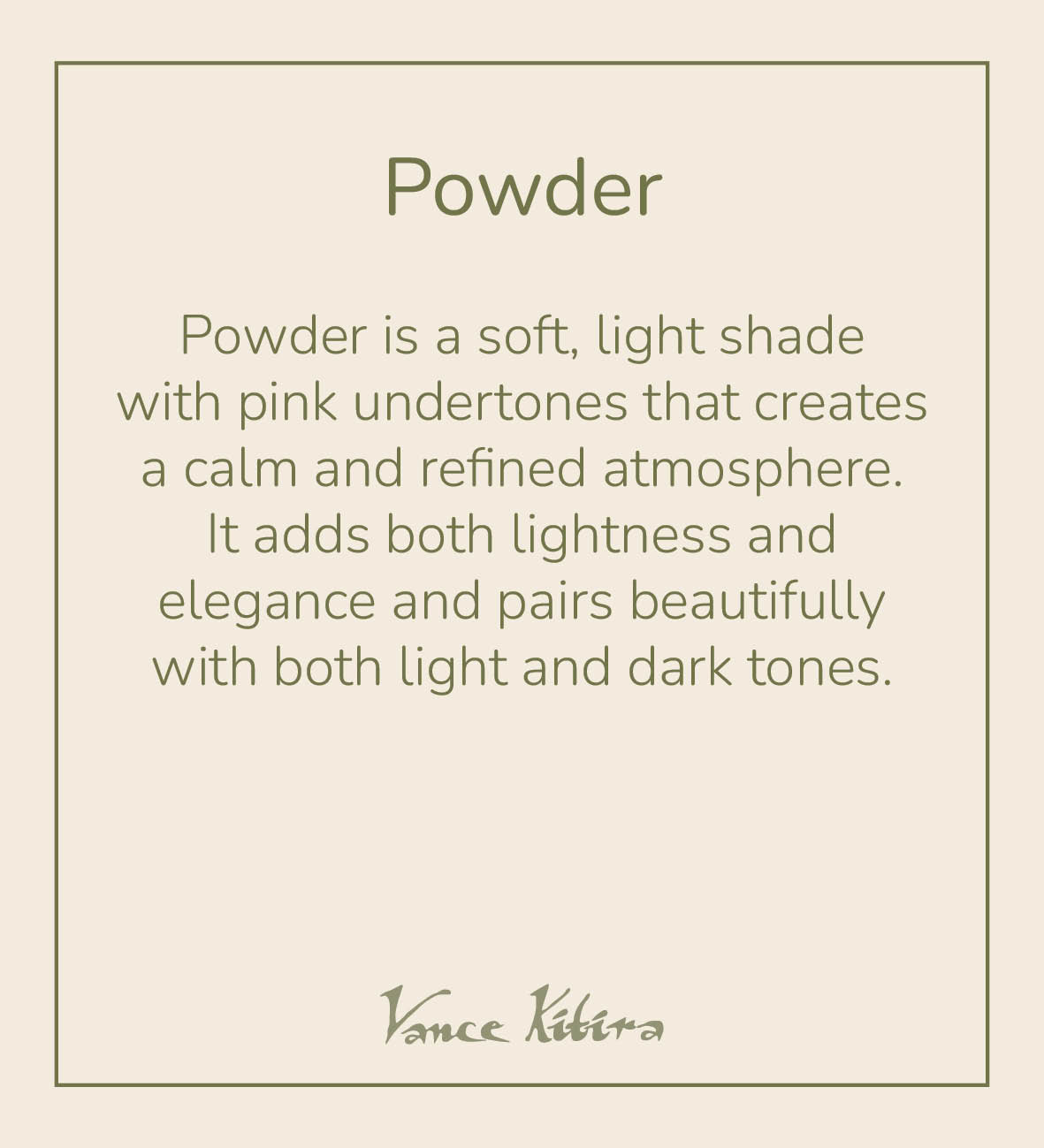 Oplev den perfekte kombination af elegance og varme med Vance Kitiras pudderfarve. Den bløde, afdæmpede nuance tilføjer en tidløs æstetik og passer smukt ind i både moderne og klassiske indretninger.
