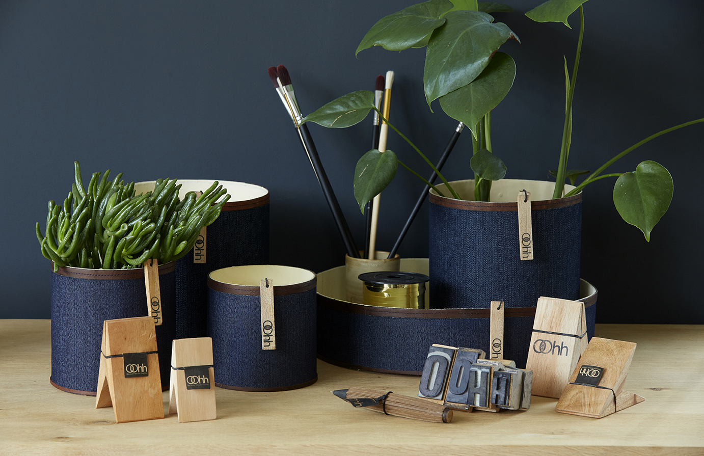 Denim, det populære tekstil vi alle kender fra jeans, er blevet brugt i denne smukke serie. Fremstillet af genbrugspapir, beklædt med overskuds denim og læder fra tekstilindustrien.