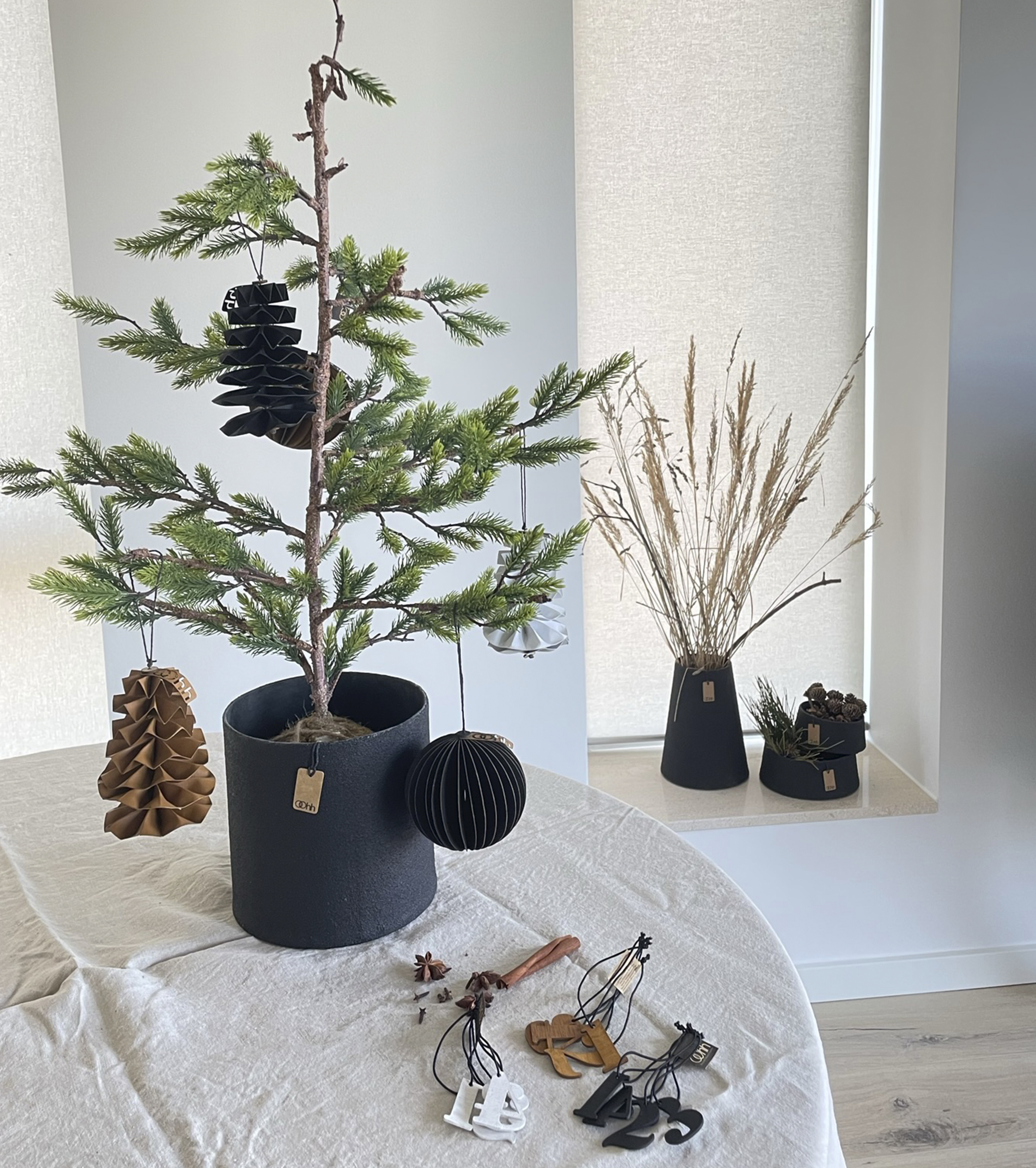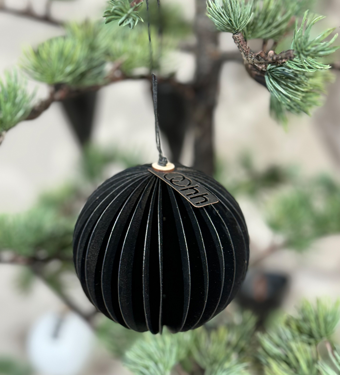 Julekugle bygget op med skiver af genbrugspapir med fin trædetalje i toppen.