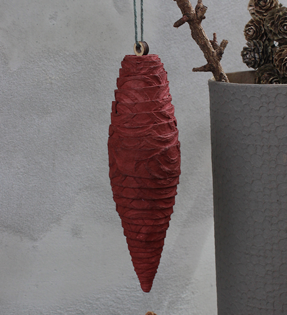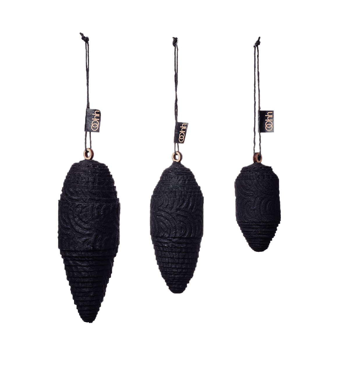 Nyd en jul med disse smukke håndrullet kogler fra OOhh Collection. Koglerne er rullet i OOhh's unikke Zero Waste papir. Formen, mønstret og varmen i papiret gør disse kogler helt unikke og de skaber det smukkeste og varmeste udtryk. Koglerne hænger i en flot lille trædetalje. Pynt det smukkeste juletræ med disse ophæng eller hæng dem ned fra loftet eller en flot gren over julebordet. Zero Waste julekollektionen tilbyder også en flot gaveæske med ophæng og et flot sæt juletræer.