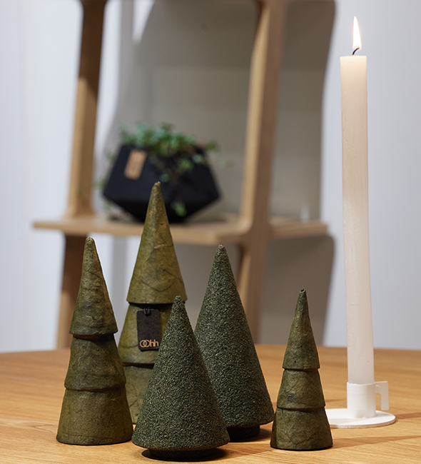 Den unikke WOODz struktur skaber en spændende nyhed i OOhhs juleprogram og kan med stor fordel kombineres med OOhhs mange andre modeller fra OOhhs julepynt. WOOD'z træerne er fremstillet af OOhh's zero waste papir, som er dekoreret med genanvendt savsmuld fra den lokale møbelindustri på Sri Lanka. Sri Lanka har en stor møbelindustri hvor mange forskellige træsorter anvendes.