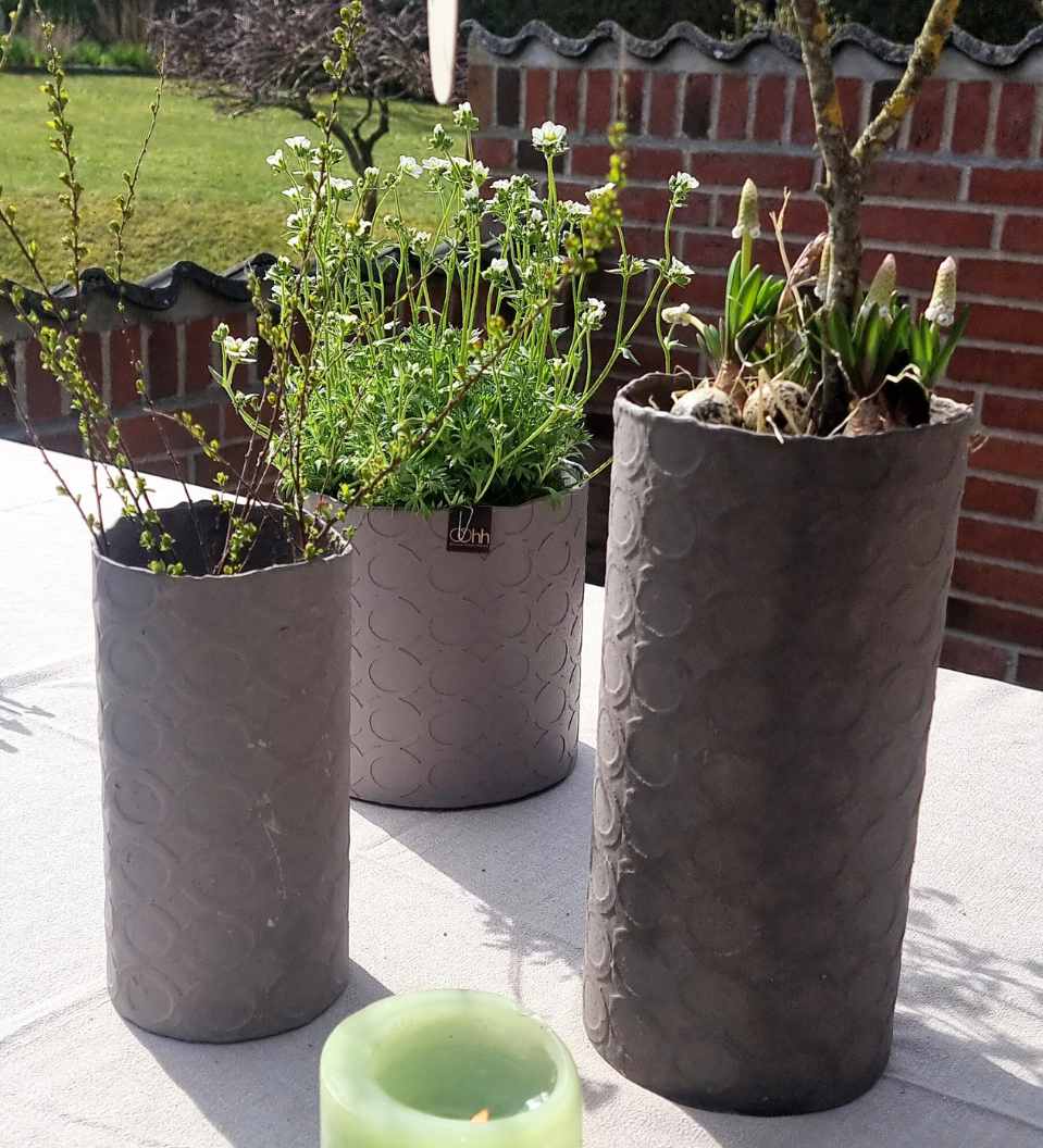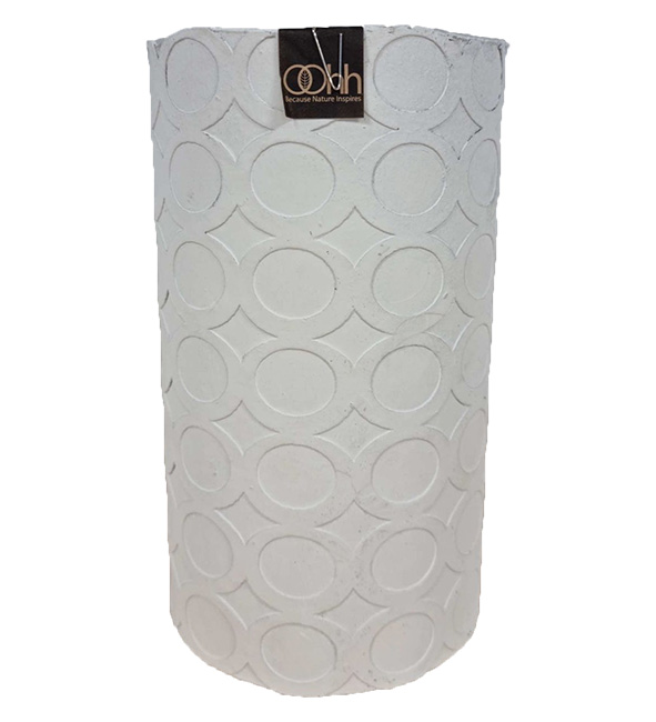 Fremstillet af genbrugspapir og naturlig latex. Inden vi farver vores potter og vaser ligger vi et ekstra lag papir, som er skåret ud og derved skaber vi et flot mønster.