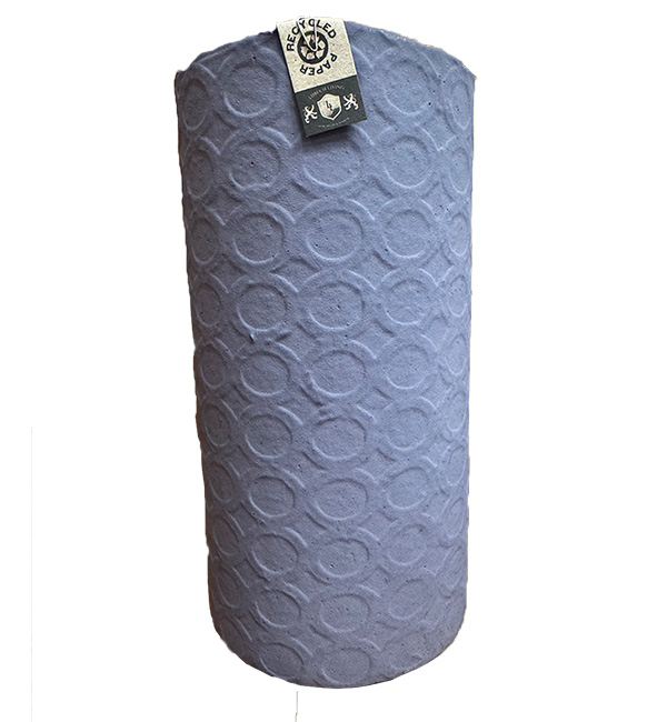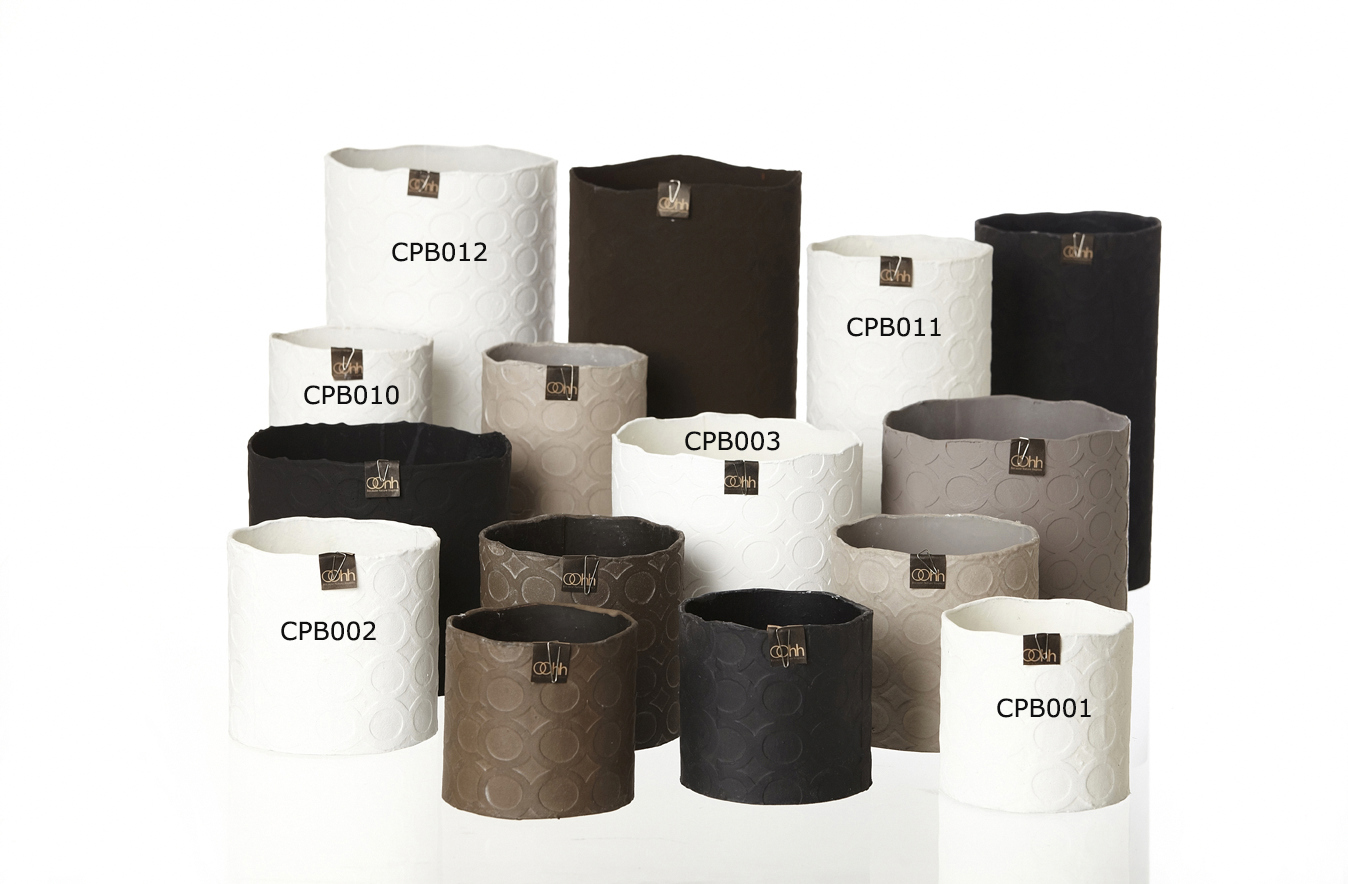 Fremstillet af genbrugspapir og naturlig latex. Inden vi farver vores potter og vaser ligger vi et ekstra lag papir, som er skåret ud og derved skaber vi et flot mønster.
